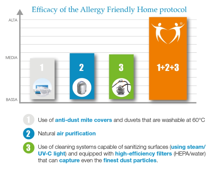 Allergy Friendly Home is a natural and ecological prophylaxis system, which through a series of combined actions is able to significantly reduce the presence of microorganisms and allergens (mites, pollen, mold, biological and chemical contaminants) present in the air, in the bed system, in fabrics and on all surfaces of the house.